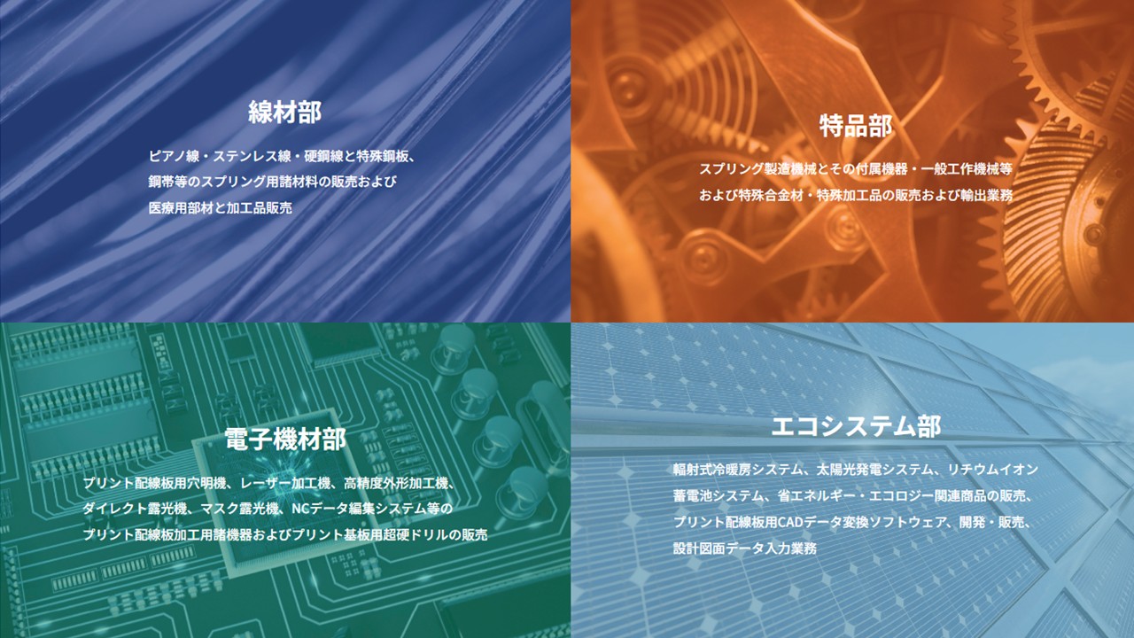 | Overview | 各種金属材料、各種加工品、機械装置、プリント配線用穴明機、レーザー加工機、高精度外径加工機、露光機、ソーラー発電蓄電システム等のエコロジー関連商品のあらゆるテーマに少量から迅速に解答をご提供する商社です。 |