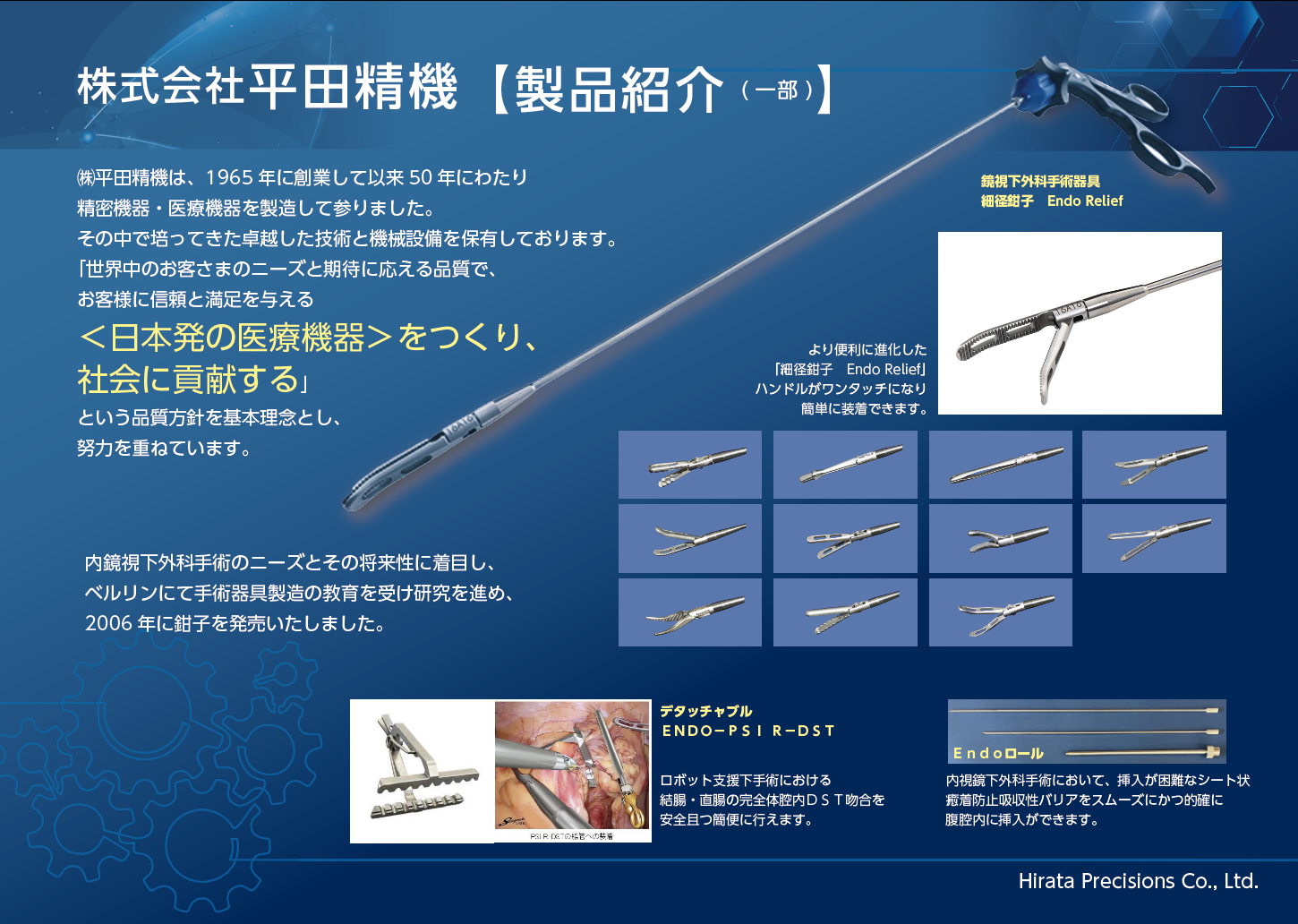 | 出展概要 | ㈱平田精機は、1965年に創業して以来50年にわたり精密機器・医療機器を製造して参りました。